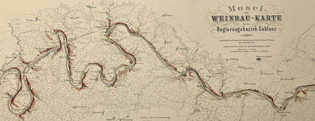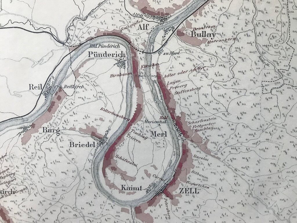 Wer den Aussichtsturm bei der Marienburg besteigt, hat den Überblick: Die Mosel bildet gegenüber von Pünderich und Briedel eine klassische OMEGA-Schleife. Seit hunderten von Jahren liegen hier die wertvollen Parzellen, schön zu sehen auf der historischen Moselkarte von 1897, auf der die besonders teuren Lagen (damals gemessen in Silbergroschen!) ganz dunkel gefärbt gezeigt werden.